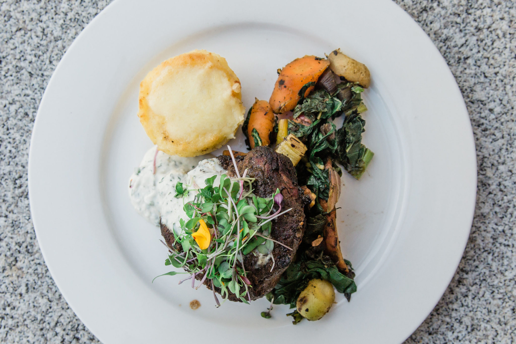 Churrasco Style Grilled Beef Tenderloin sliced and served with Creamy Chimichurri, Pickled Red Onion, Local Yeast Rolls