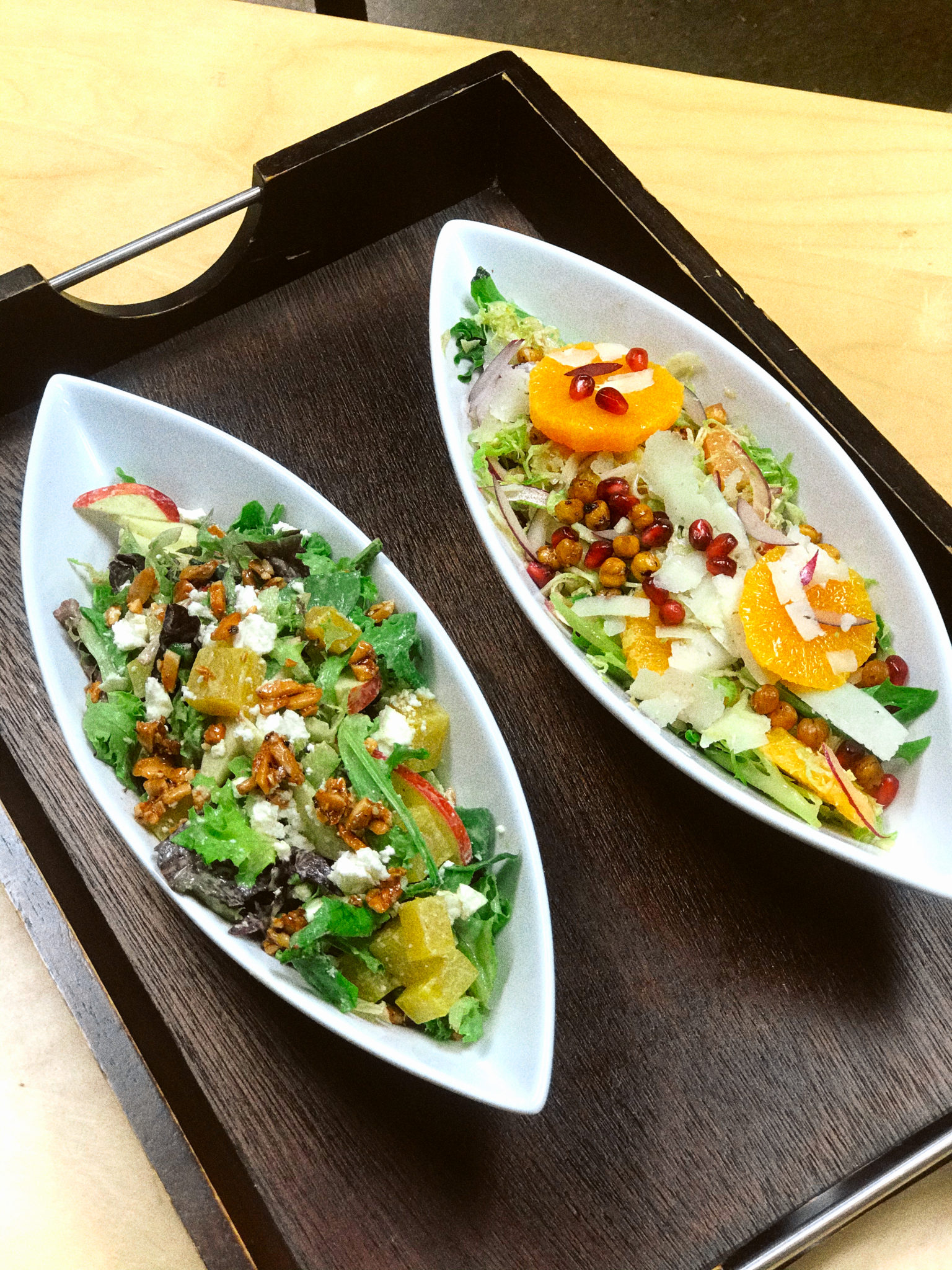 Mixed green salad with roasted beets, honey crisp apples, feta cheese, chili candied almonds, maple tahini vinaigrette